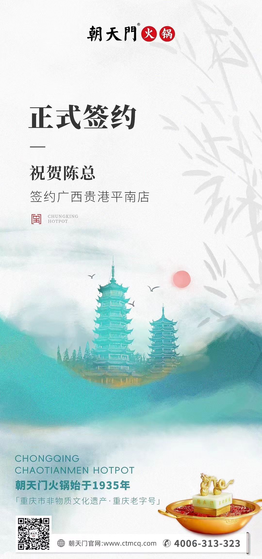 廣西貴港平南縣陳總慧眼如炬,選擇加入朝天門這個(gè)有溫度有力量的大家庭,我們相信,這不僅是陳總對(duì)重慶地道火鍋的厚愛,更是對(duì)朝天門品牌的信任與支持,朝天門火鍋勢(shì)必在廣西餐飲市場(chǎng)大展宏圖,也提前預(yù)祝陳總生意興隆,財(cái)源廣進(jìn)!