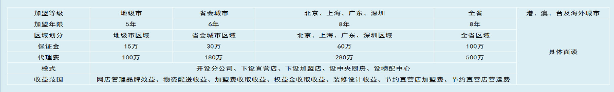 下面,見詳細(xì)的費(fèi)用標(biāo)準(zhǔn)分析,是針對區(qū)域或城市的等級以及店鋪面積的大小來制定,分為單店以及區(qū)域兩種標(biāo)準(zhǔn):